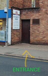 once you have parked up just cross over John street – you will see the Rear Side of the Charity shop in front of you, just walk towards the main street and left a few meters to the Brown door as pictured above.
